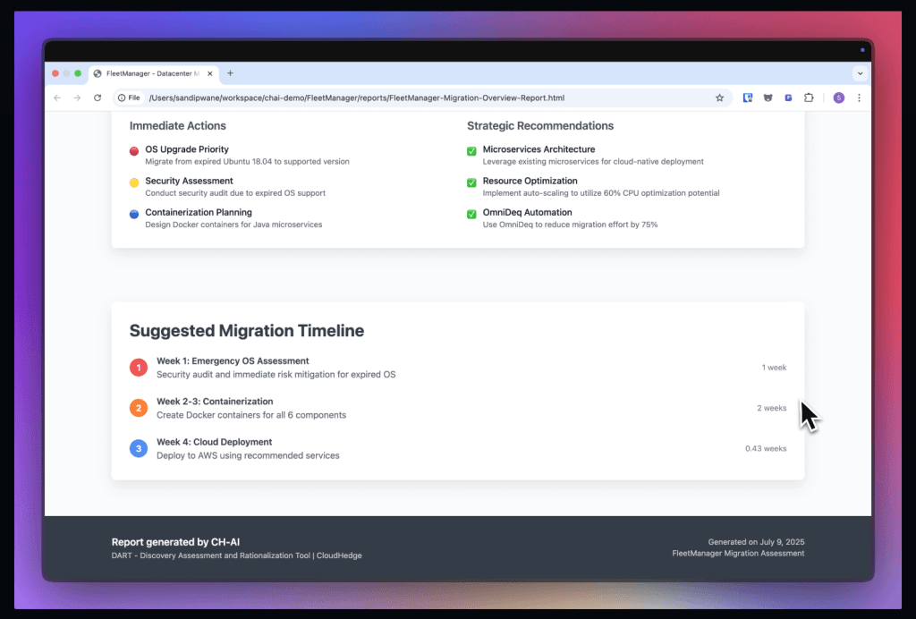 CHAI DART™ empowers your teams to analyze, plan, and modernize faster than ever before. Whether you’re evaluating cloud migration, reducing technical debt, or adopting AI-powered transformation, DART helps you make confident, data-driven decisions.