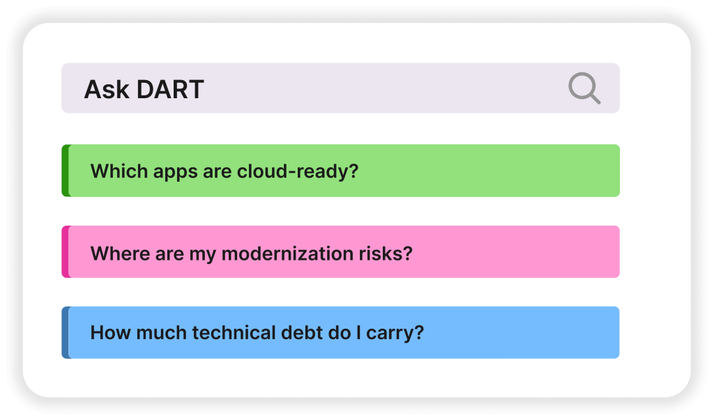DART solves these challenges by offering conversational AI along with deep context with our patented automated analysis, and continuous intelligence to simplify and accelerate enterprise-wide modernization.